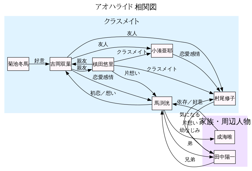 相関図を頭に入れながらアオハライドの世界をおさらいしたい方や、これからどの媒体から触れようか迷っている方の参考になればうれしいです。