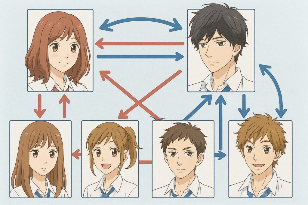 物語の終盤では、修学旅行や進路選択、家族との関係の変化など、青春の大きな岐路となる出来事が立て続けに起こり、それぞれのキャラクターが自分の気持ちと向き合うことで、相関図の線が最終的な形へと収束していきます。