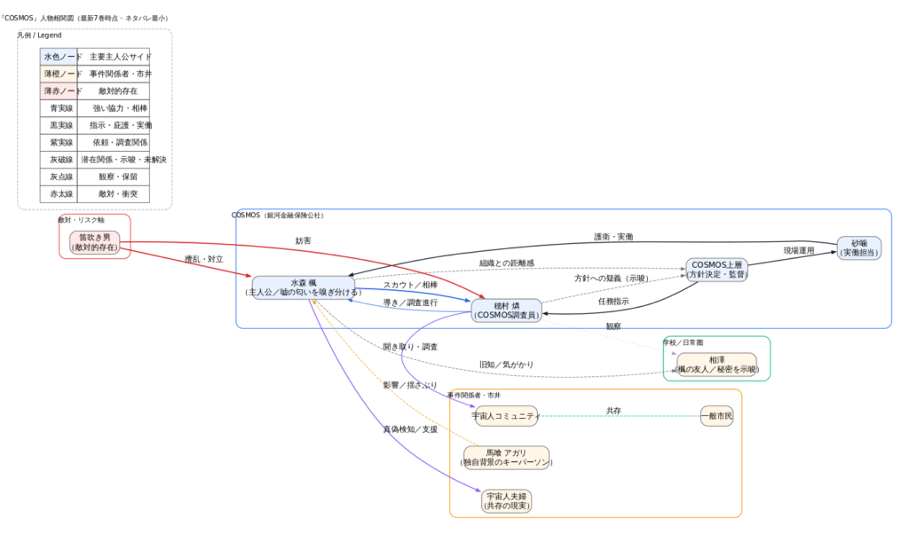 相関図のコツは、人物と所属(COSMOS、一般市民、宇宙人コミュニティなど)を色分けし、感情の推移は矢印や線の種類で追記することです。