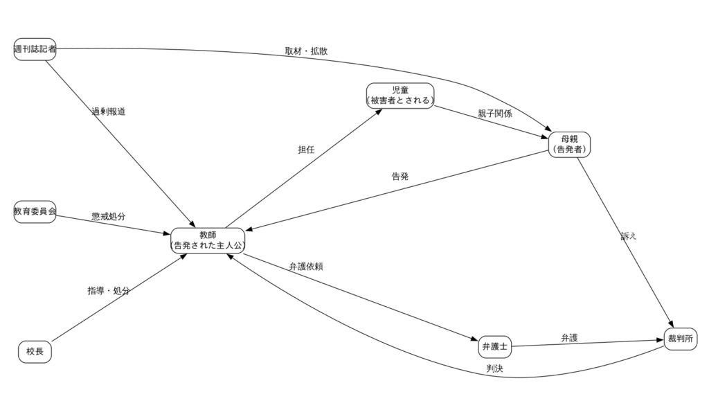 ここでの相関図のコツは、人物を「告発する側」「告発される側」で二分して終わらせないことです。
