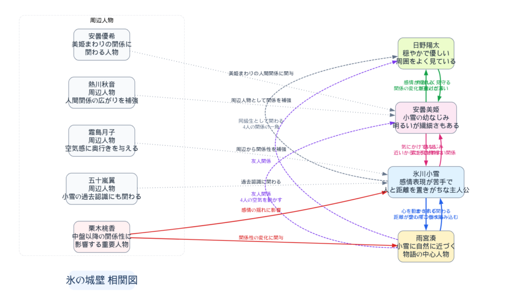 氷の城壁の相関図は、一方向の片思いだけでなく、友情、気遣い、遠慮、誤解が重なっているのが大きな特徴です。