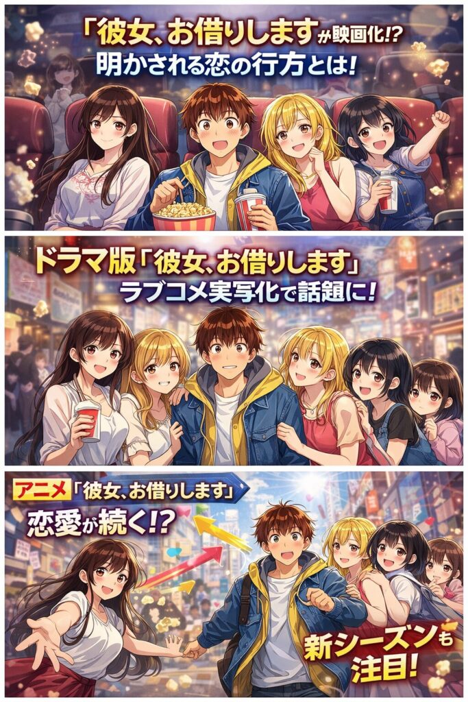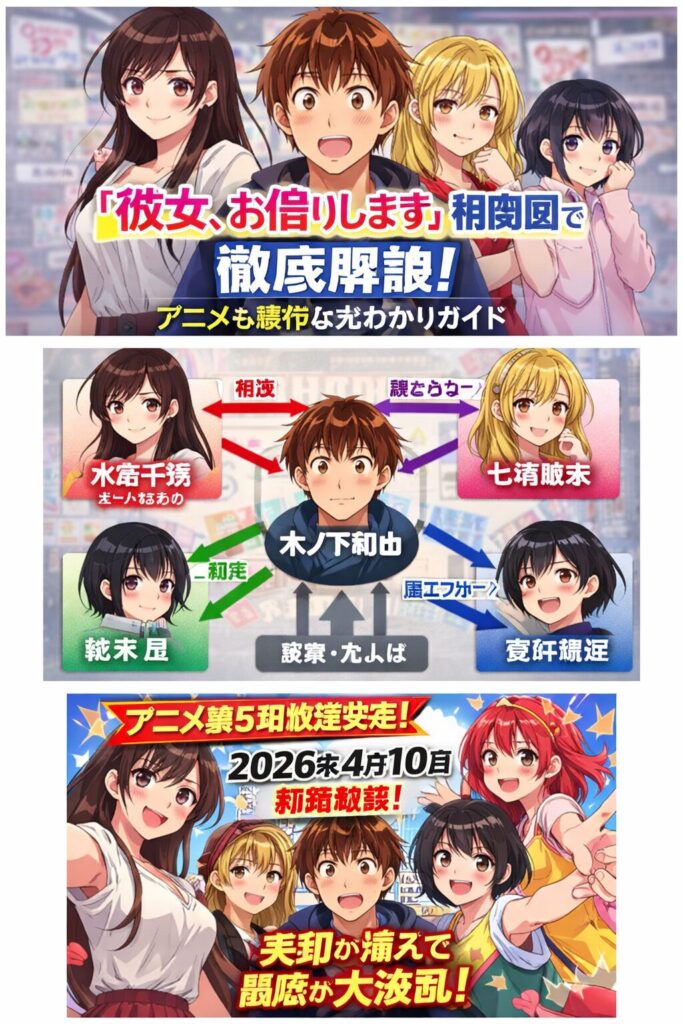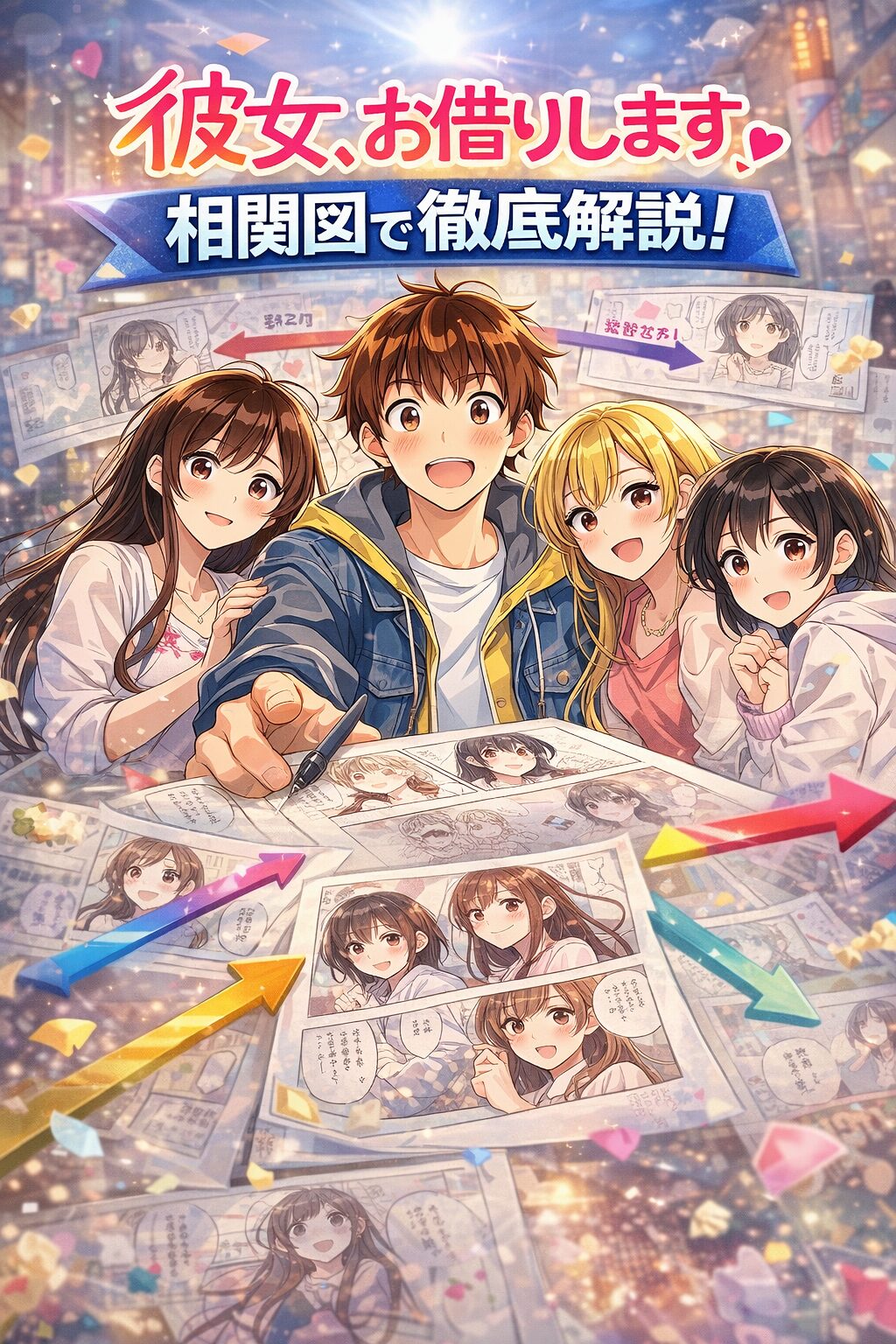 「彼女、お借りします」の相関図を見ながら、あらすじやキャラクターの関係、アニメ最新情報、見どころ、作者、完結状況、そしてどこで読めるかまでまとめて整理します。