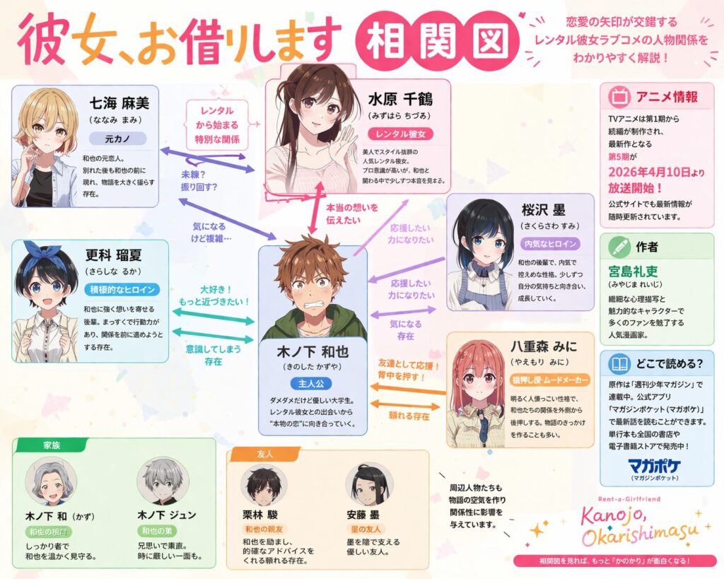彼女、お借りしますの相関図で登場人物の関係をわかりやすく整理。あらすじ、キャラクター、アニメ第5期情報、見どころ、作者、完結状況、どこで読めるかまでまとめて解説します。