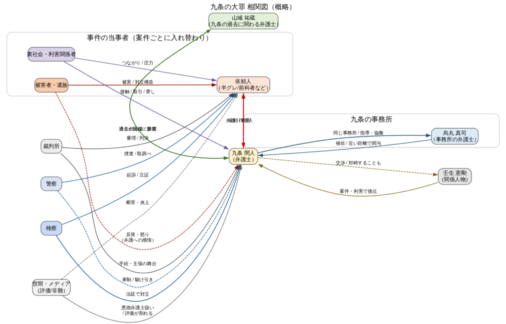 相関図的に見ると、九条を中心に、依頼人、被害者、警察、検察、裏社会、そして“九条の過去”に関わる人物が、事件ごとに線で結ばれていきます。