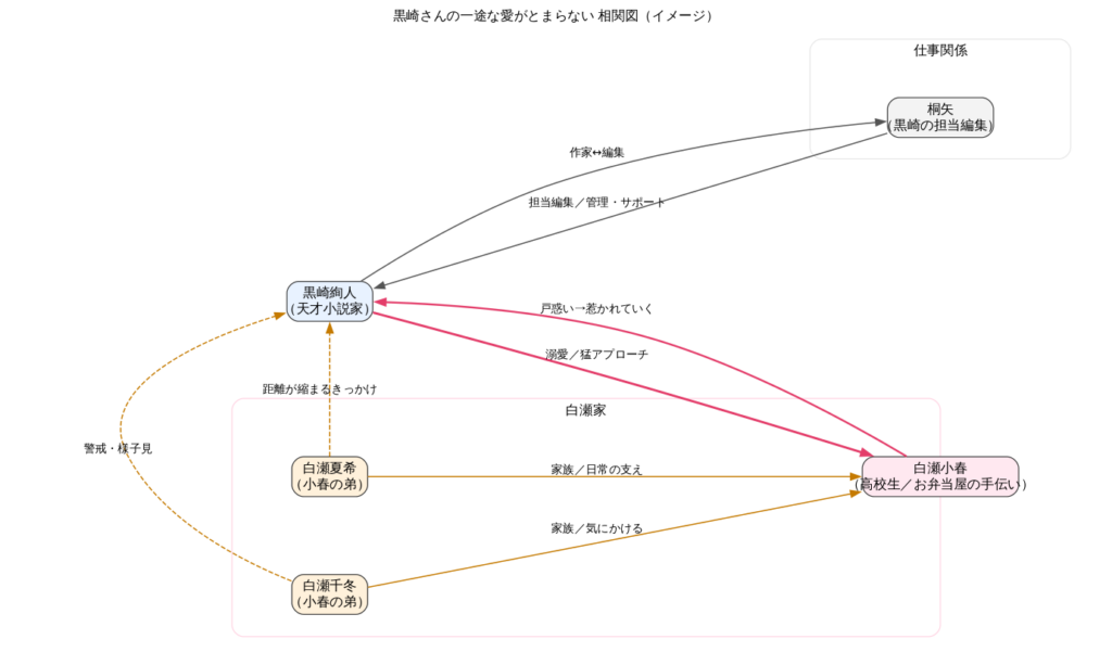 相関図で見ると、中心は「小春⇄黒崎」の二人ですが、そこに担当編集の桐矢が実務面とツッコミ役として入り、二人の関係が現実的に動いていきます。