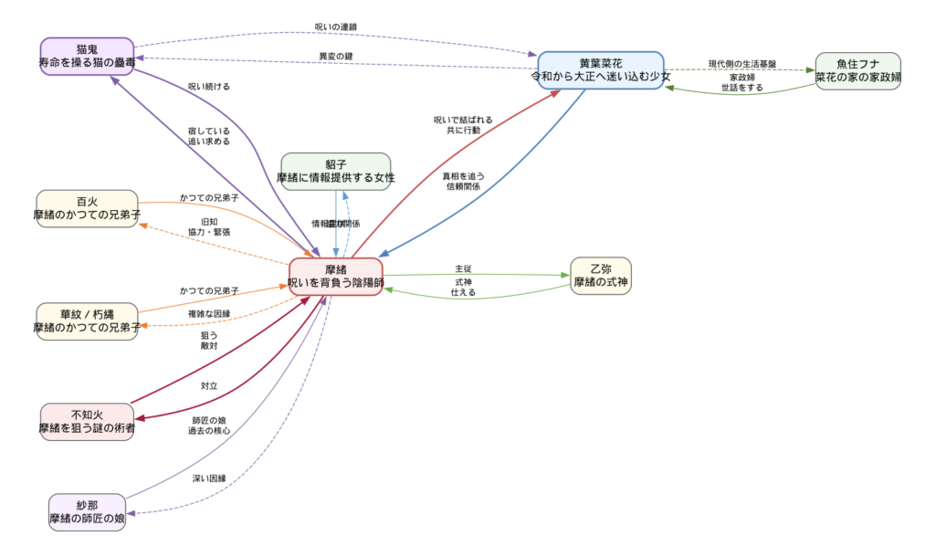 | 摩緒 | 主人公の陰陽師 | 長い時を生きる呪われた存在 | 菜花と猫鬼の呪いでつながる中心人物 |
