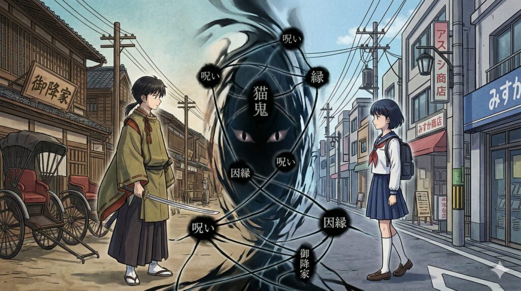 そのため、物語は一話ごとの怪異事件を追う楽しさがありながら、全体としては御降家崩壊の真相や猫鬼の正体へ近づいていく大きなミステリーとして進行します。