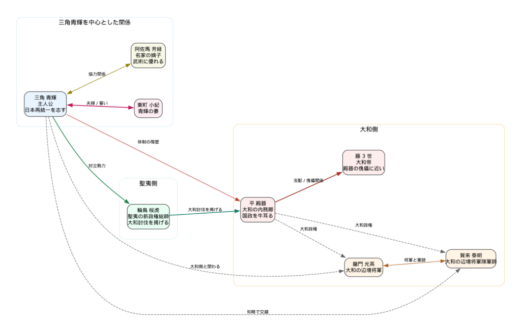 『日本三國』の相関図は、三角青輝を軸に、家族・同志・将軍・権力者・敵対勢力が複雑に絡み合うのが大きな特徴です。