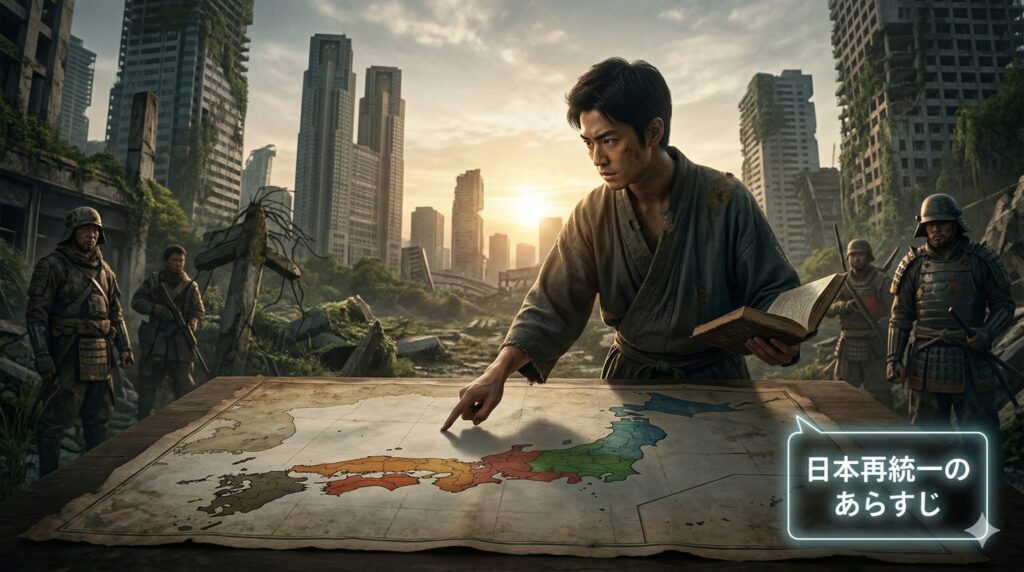 第1話では、文明崩壊後の日本という強烈な世界観と、三角青輝が再統一を目指す物語の起点がまとめて提示されます。