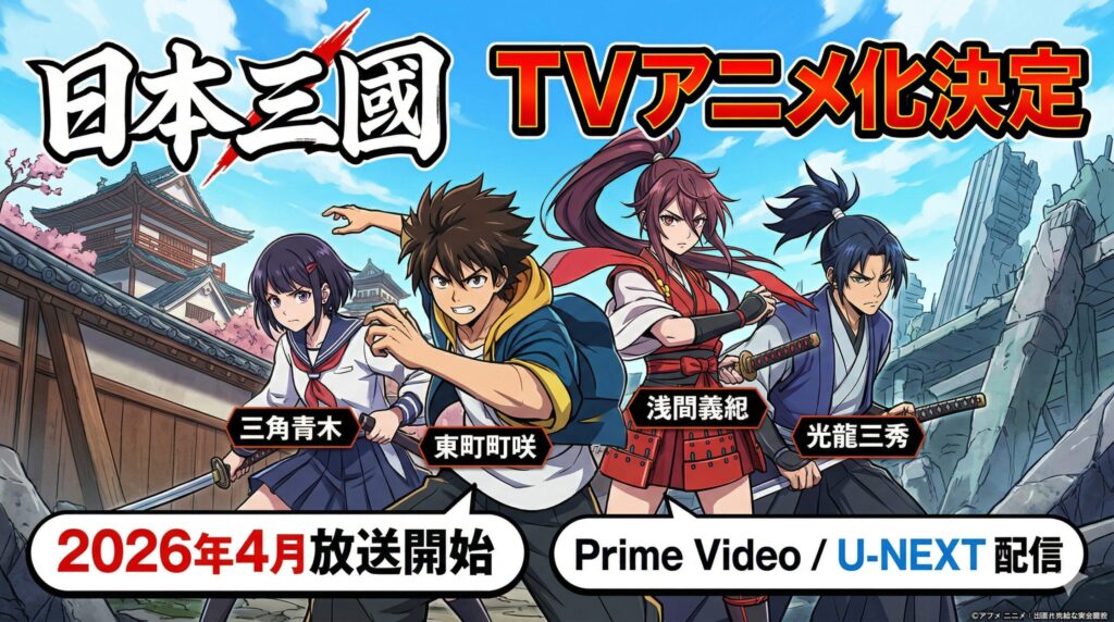 『日本三國』のTVアニメは2026年4月に放送開始となり、Prime VideoとU-NEXTでも公式に配信されています。