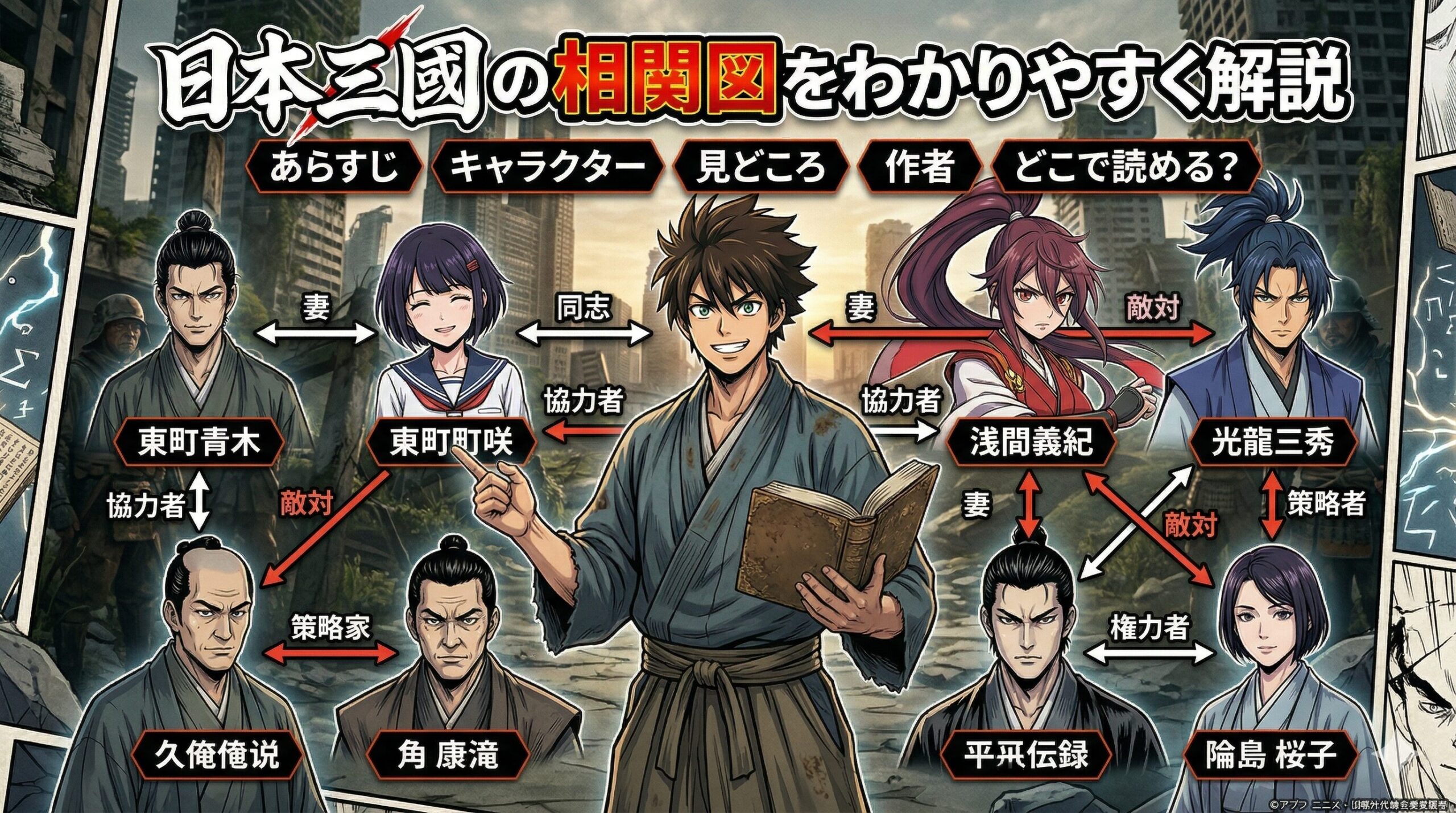 『日本三國』の相関図をきっかけに、あらすじ、キャラクター、アニメ、見どころ、作者、完結状況までまとめて押さえて、ぜひ作品世界をじっくり楽しんでみてください。