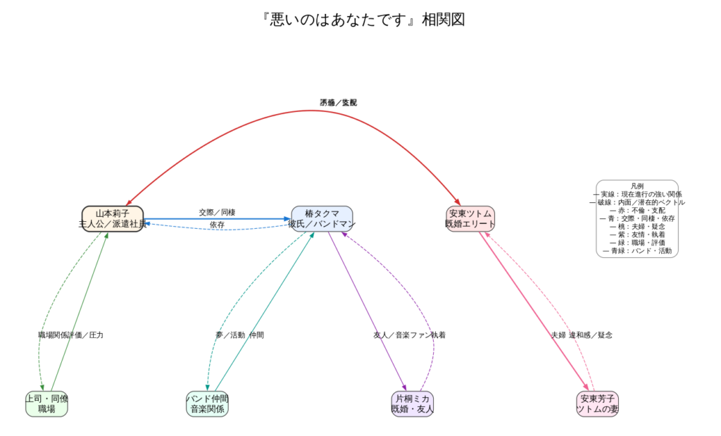 『悪いのはあなたです』は、相関図で可視化することで人物の欲望と依存のベクトルが交差し、あらすじの理解が一気に進む物語です。